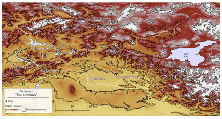 Öncelikle, birliklerinin dış bir bölgeden Germiyan’a kaçtığını ve bölgenin sınırları içinde hareket etmediğini belirtmekte fayda var. Bu, Tatvan’ın güneyindeki ve Mayyafariqin’in kuzeyindeki dağ sırasını Germiyan’ın güney sınırları olarak belirlememizi sağlar. Ayrıca Tatvan’ın, Arap coğrafyacıların Zuzan’ın kuzey sınırı olarak tanımladığı bir yer olan Ahlat’tan birkaç kilometre uzakta olduğunu belirtmek de önemlidir. Zuzan, “yazlık mera bölgesi” ile Germiyan “kışlık mera bölgesi” arasındaki yakınlık, göz ardı edilemeyecek kadar uygun ve çarpıcıdır. Kısacası, Germiyan, Germiyaniye’nin anavatanı, batıda Malatya, kuzeyde Erzurum, güneyde Anti Toros Dağları, Diyarbakır ve Meyyafariqin’in kuzeyi, doğuda ise Tatvan, Ahlat ve Zuzan bölgesi arasında yer alıyordu. (Bak Şekil 1)[49]