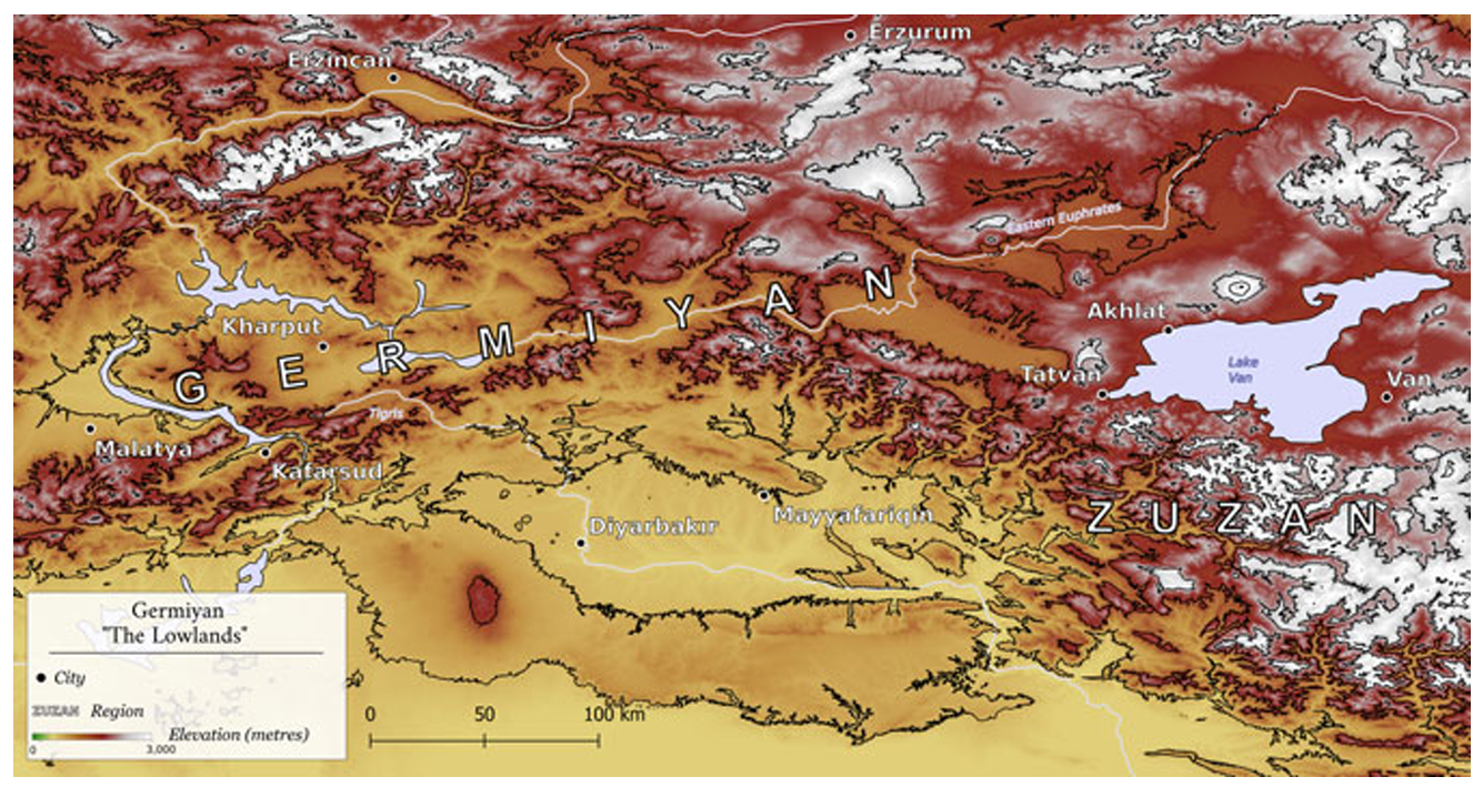 Bu nedenle, ilk bakışta “germiyan”ın “ovalar” veya “kış otlakları” anlamına gelen Kürt kökenli bir isim olduğu sonucuna varmak güvenli görünüyor. Ancak, hiçbir ortaçağ Kürtçe sözlüğünün günümüze ulaşmadığını düşünürsek, temellerinin çoğu modern etimolojiye dayandığı için, böyle bir teoriye anakronik ve belki de temelsiz olarak karşı çıkmak cazip gelebilir. Diller zamanla değişir ve “Germiyan” bin yıl önce farklı bir şey ifade ediyor olabilir. Yine de, bu sefer ortaçağ kaynaklarına dayanan başka bir unsur, Kürt bağlantısına ek bir güvenilirlik kazandırmaktadır. On ikinci ve on üçüncü yüzyıl Müslüman tarihçilerinin ve coğrafyacılarının çalışmaları, Van Gölü’nün güneyindeki dağlık bölgelerde bulunan “zuzan” veya “Kürtlerin Zuzanı” (Zuzan el-Ekrad) olarak bilinen bir bölgeye bolca atıfta bulunur. Modern Kurmanci’de, “zuzan” (zozan olarak yazılır) “germiyan”ın zıttıdır ve “soğuk yerler”, “yaylalar” ve “yazlık otlaklar” anlamına gelir. [37] Belki de göçebelik antropologları tarafından daha sık kullanılan Türk kelime dağarcığına alışkın okuyucular için, zuzan/germiyan çifti, Türkçe yayla/kışlak’ın Kürtçe karşılığıdır. “Zuzan” kelimesinin kökenleri, etimolojisi ve anlamı Boris James tarafından uzun uzadıya tartışılmıştır. Ancak James ihtiyatlı davranarak “zuzan”a modern anlamını atfetmeyi reddeder. James bu nedenle Orta Çağ’da “zuzan”ın sadece Kürtlerin değil, aynı zamanda büyük bir Ermeni topluluğunun yaşadığı Doğu Anadolu’daki bir bölgeyi ifade ettiği sonucuna varır, yaz otlakları için genel bir kelime değildir. [38] James’in haklı ihtiyatlı tutumuna rağmen, on üçüncü ila on beşinci yüzyıllara dayanan çok çeşitli kaynaklar, her yaz, Doğu Anadolu’daki Kürt ve Türk göçebelerinin çoğunun Zuzan’ı otlak olarak kullandığını göstermektedir.